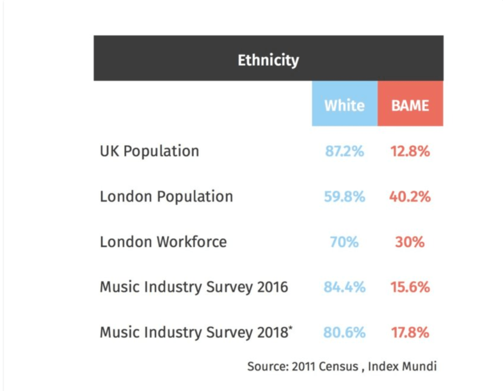 As of 2018, BAME from UK Music’s Diversity Report, just 17.8% of BAME (Black, Asian and Minority Ethic) individuals represented the music industry – while white people dominated with their huge 80%.