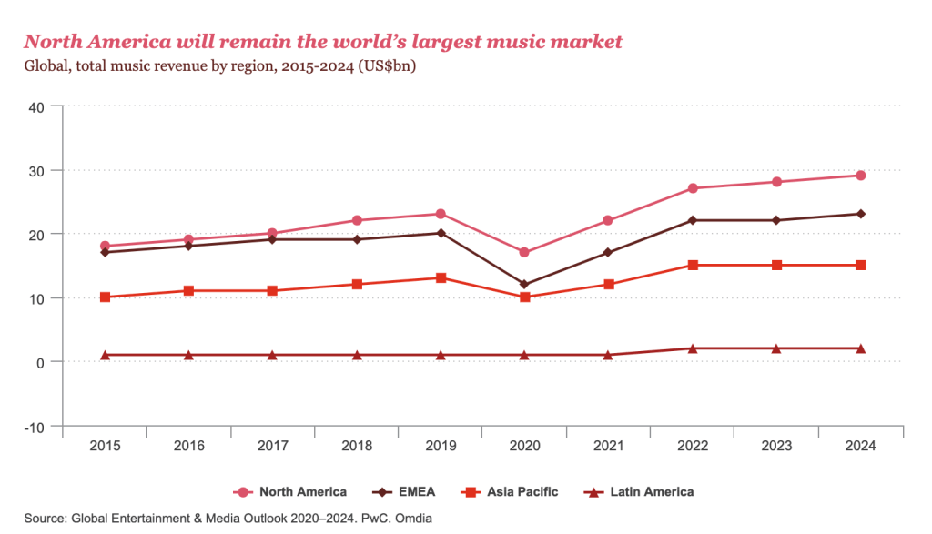 It seems that North America will remain the world’s largest music market until 2024, with streaming remaining the imperative function for the industry to survive after COVID regulations.